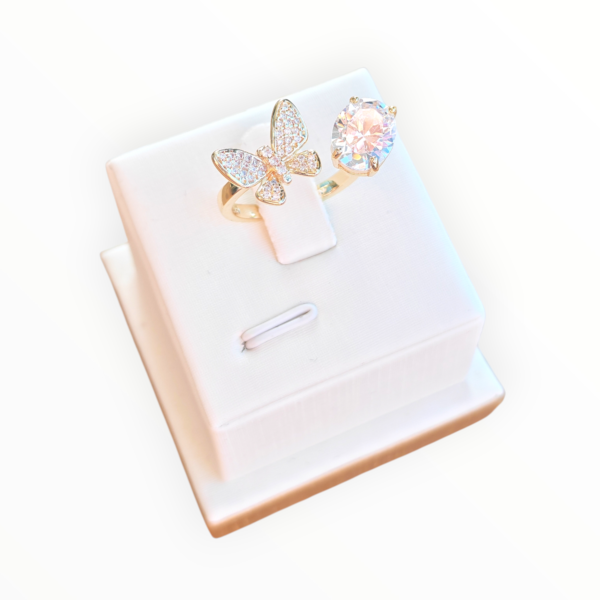 Este anillo captura la esencia de lo etéreo con su mariposa enchapada en oro laminado 14K, adornada con microcristales que reflejan la luz con cada movimiento. Su diseño ajustable se adapta cómodamente a distintos tamaños de dedo, ideal para regalar o usar a diario.