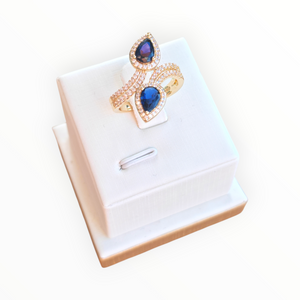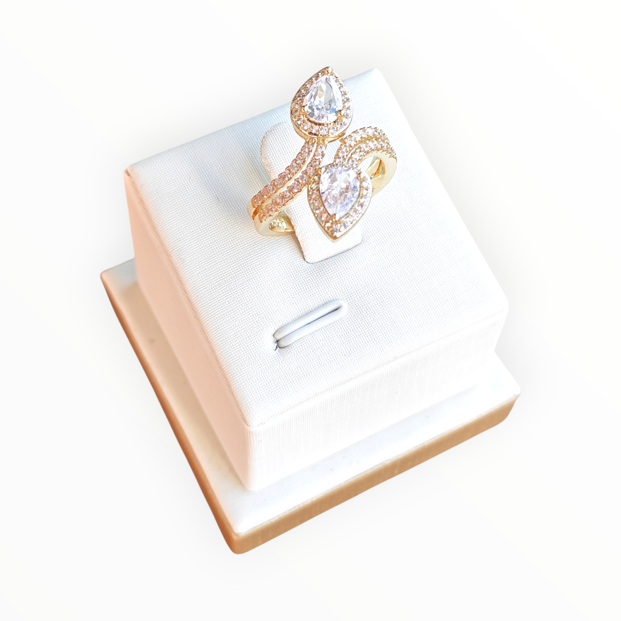 Este anillo de lujo combina diseño y brillo en una pieza inolvidable. Fabricado en cobre con laminado de oro 14K, presenta dos gemas en forma de lágrima rodeadas por halos de microcristales, creando un efecto de luz deslumbrante. La banda dividida, también enchapada con piedras, aporta simetría y sofisticación.