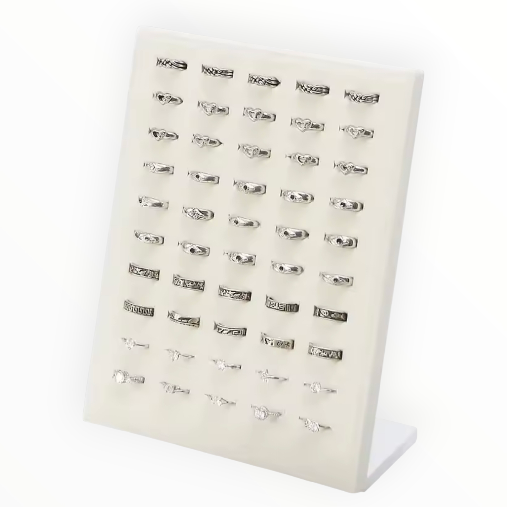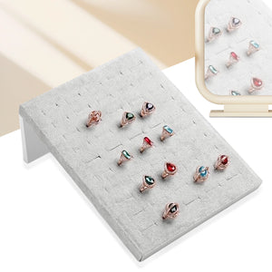 Este exhibidor de anillos presenta una estructura inclinada que maximiza la visibilidad y el impacto visual de cada pieza. Perrmite organizar múltiples diseños en forma de cuadrícula, desde grabados geométricos hasta engastes con piedras. Perfecto para mostrar colecciones completas, transmitir orden y sofisticación, y facilitar la elección del cliente en entornos físicos o digitales.